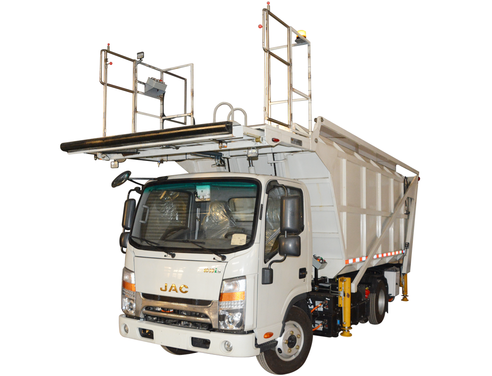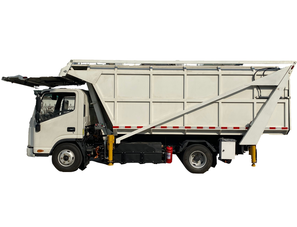 DGR10e型電動飛機垃圾接收車,主要由新能源汽車二類底盤、副車架、垃圾箱體總成、舉升門架、液壓傳動系統、電氣系統組成。